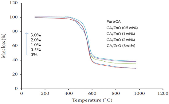 Thermal analysis (TGA) provides information on the decomposition temperature (Td) of a substance. It is defined as the temperature at 3% weight loss. A simultaneous thermal analyzer (Netzsch, STA429 CD) was used to investigate the weight loss of both the bare CA and composite ZnO membranes. The decomposition temperature of the pure CA and CA/ZnO membrane followed a similar trend. The temperature gradually increased with the increasing addition of ZnO on CA membranes (Figure 8). Addition of ZnO nanoparticles improved the thermal stability of the CA membranes.