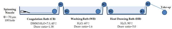 Figure 2 represents the scheme of wet-spinning system. The PANVDC fibers, along with the types of flame retardants, were prepared using a laboratory-scale wet-spinning system [16]. DMSO was used as the solvent because it is relatively less toxic than other solvents. To prepare the spinning solution, 35 wt.% of PANVDC was dissolved in DMSO. The flame retardant, either Sb2O3 (ATO(3)) or Sb2O4 (ATO(4)), was dispersed using an ultrasonic bath (Power sonic 420, Whashin Tech Co., Gyeonggi, South Korea) for 20 min. For the wet-spinning process, the prepared spinning solution was stored at 50 °C, and filtered through a 400 mesh, and spun into a DMSO/H2O coagulation bath (70/30 w/w) using a 100-filament spinneret with 70 μm capillary diameters at a speed of 1.22 mL/min. Distilled water was used for the washing bath and heat drawing bath. Subsequently, the residual solvent was prepared by drawing and drying processes. The fibers were finally dried in a 60 °C convection oven for 24 h.
