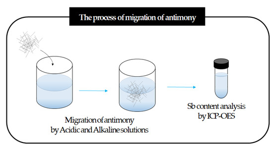 According to the standard of KS G ISO 8124-3 and KS K 0731, antimony elution was evaluated in acidic and alkaline solutions, such as sweat and saliva. Figure 3 shows the process of migration of antimony. First, impregnating a 100 mg fiber specimen in the test solution. Using that solution, centrifugation was performed to separate the specimen and the eluate. After that, antimony contents in this solution were investigated through inductively coupled plasma–optical emission spectroscopy (ICP-OES, ULTIMA 2, HORIBA Scientific, Kyoto, Japan). The evaluation was performed after stabilizing the eluate concentration to 1 mol/L for storage for more than one day.
