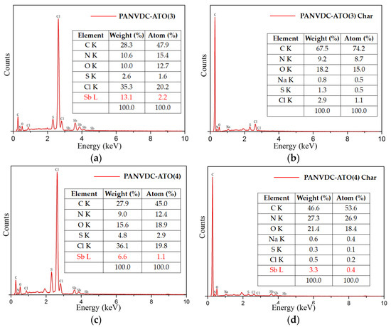 Figure 4 presents the SEM-EDX results of the char layers before/after the combustion of PANVDC films containing antimony oxide. As shown in Figure 4a,c, before the combustion of the ATO(3)- and ATO(4)-added films in PANVDC, antimony oxide was observed on the sample surfaces. After combustion, there was no ATO(3) in the PANVDC-ATO(3) char, and a smaller amount of ATO(4) remained in the PANVDC-ATO(4) char (Figure 4b,d). This is because ATO and HCl act mainly as flame retardants in the gas phase. In addition, Sb was detected on the surface of the PANVDC-ATO(4) because ATO(4) has a higher heat resistance after combustion.
