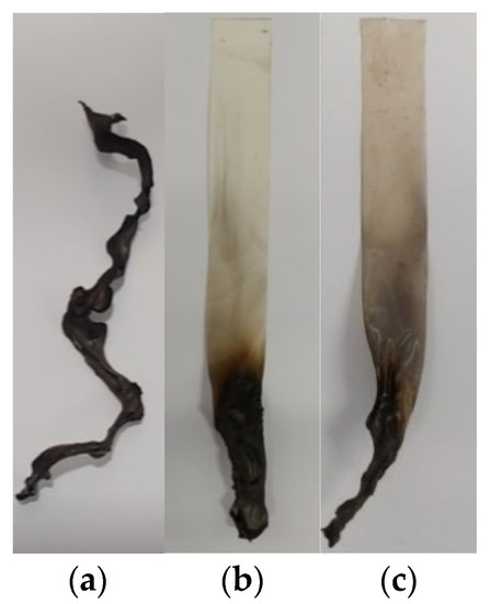 Table 2 and Figure 5 present the UL 94 testing result and photographs of samples after the combustion process, which lasted 10 s. Pure PANVDC was burned immediately when exposed to the flame, and extinguished itself when the flame was removed. As shown in Figure 5a, the PANVDC was totally burned and blackened by smoke during burning. On the other hand, when ATO(3) or ATO(4) were added to PANVDC films, approximately 30% of the sample was burned; hence, both samples presented a V-0 rating in the UL94 test. Thus, flame retardancy could be improved by adding antimony oxide to PANVDC.