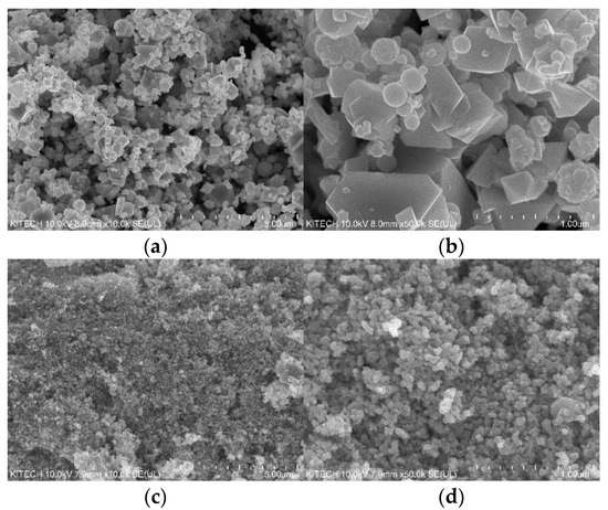 FE-SEM images of the powder particles of (a) ATO(3) ×10,000, (b) ATO(3) ×50,000, (c) ATO(4) ×10,000, and (d) ATO(4) ×50,000.