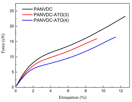 Table 3 and Figure 8 present the mechanical properties of PANVDC fibers with two types of antimony oxides. The three types of PANVDC fibers were washed and drawn in hot water baths in a continuous process to remove the excess solvent and increase the orientation of the PANVDC chains. As shown in Table 3, the tenacity values of the pure PANVDC, PANVDC-ATO(3), and PANVDC-ATO(4) were 4.42 ± 0.25 g/den, 3.11 ± 0.41 g/den, and 3.73 ± 0.16 g/den, respectively. In the case of elongation, pure PANVDC, PANVDC-ATO(3), and PANVDC-ATO(4) showed an elongation of 12.52 ± 0.34%, 9.34 ± 1.02%, and 11.32 ± 0.59%, respectively. The PANVDC containing the flame retardants showed a slightly lower tenacity and elongation. As confirmed in the FE-SEM images, both tenacity and elongation decreased due to the effect of the pores formed by the addition of antimony oxide. The strength and elongation of PANVDC-ATO(4) were superior to those of PANVDC-ATO(3). The powder particle size of ATO(4) was relatively smaller than ATO(3), it was confirmed that relatively smaller particles were distributed in PANVDC-ATO(4) than in PANVDC-ATO(3), and there was a lower number of pores in the cross-sectional image of the fiber. Thus, PANVDC-ATO(4) exhibited superior mechanical properties compared to PANVDC-ATO(3).