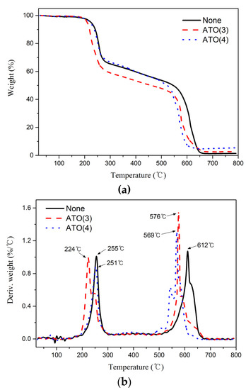 Based on the above result, the LOI was measured to compare the relative flammability of both PANVDC-ATO(3) and PANVDC-ATO(4). As shown in Table 2, the LOI of pure PANVDC, PANVDC-ATO(3), and PANVDC-ATO(4) films were 26.4%, 29.0%, and 31.2%, respectively. The LOI values of the antimony oxide-added PANVDC were higher than pure PANVDC film. In addition, when comparing the types of antimony oxides, the LOI of PANVDC-ATO(4) was 31.2%, higher than that of PANVDC-ATO(3), which was 29.0%. This results indicate that ATO(4) exhibited higher flame retardancy efficiency because it has a high heat resistance owing to its stable structure and properties.