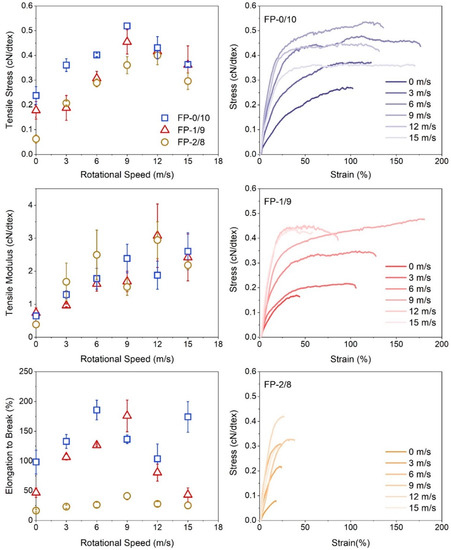 Oriented fibers produced from the spinning dopes of FP-0/10 at 8 wt%, FP-1/9 at 8 wt%, and FP-2/8 at 6 wt% were collected at rotational speeds of 3, 6, 9, 12, and 15 mm/s.