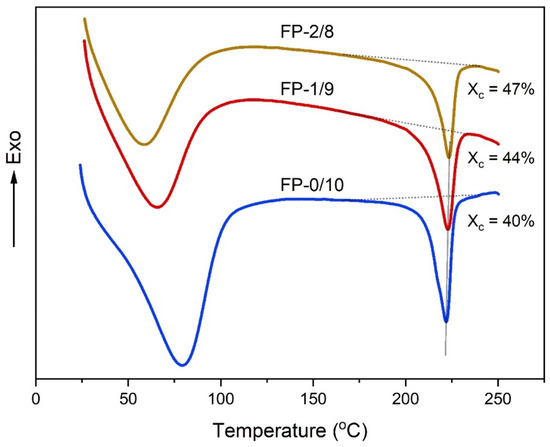 Figure 5 shows the DSC curves of the composite fibers. Since FNFs belong to thermosetting polymer, the DSC curve will not show the exothermic or endothermic peak. The crystallinity of the PVA, calculated from the melting peak area, increased with increasing the content of FNFs. It was reported that the crystallinity of PVA was increased when cellulose nanofibers or carbon nanotubes were mixed [26,27]. Accordingly, the FNFs also can act as a nucleating agent that promotes the crystallinity of PVA. Moreover, the melting temperature (Tm) of FP-0/10, FP-1/9, and FP-2/8 were detected at 222.1 °C, 222.9 °C, and 223.5 °C, respectively, that is, the Tm of PVA was slightly increased with increasing FNFs contents. However, previous studies suggested that the Tm of PVA was decreased with adding cellulose nanofibers or whiskers [28,29]. This is ascribed to the strong hydrogen bonding with the PVA and surface of cellulose which inhibit the capability of the PVA chains to increase the crystal size of PVA [29,30]. While some few hydroxyl groups on the surface of FNFs should not significantly restrict the alignment of the PVA chains. These results suggest that the crystallinity of PVA in electrospun nanofibers could be increased with the adding of FNFs.