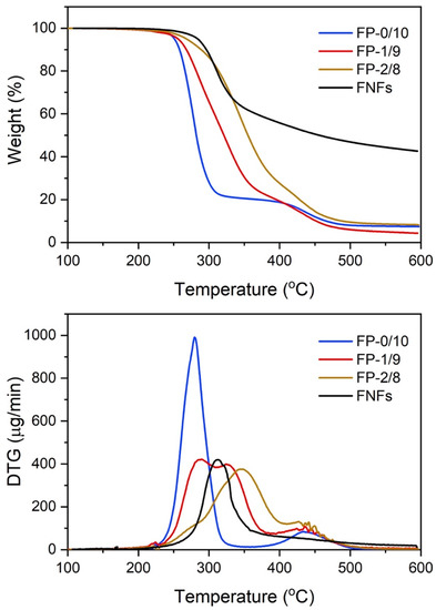 TG and DTG curves for PVA, FNFs, and FNF/PVA composite nanofibers.