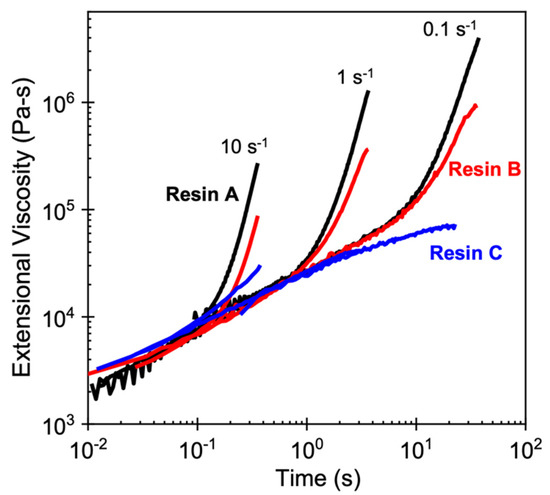 Extensional rheology of the three resins used for foaming studies in this work. Measurements were performed at 190 °C using an ARES-G2 rheometer with SER fixture based on the ExxonMobil test method EM514. SHR values at an extension rate of 1 s−1 and a Hencky strain of 3 for Resin A, Resin B, and Resin C are 13, 5.6, and 1.0, respectively.
