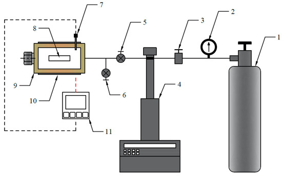 Schematic representation of the batch foaming system: (1) CO2 cylinder, (2) pressure gauge, (3) refill valve, (4) syringe pump, (5) inlet valve, (6) exhaust valve, (7) thermocouple, (8) sample, (9) chamber, (10) band heater, and (11) temperature controller.