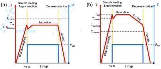 Temperature–pressure profile of foaming method used to investigate the effect of (a) partial (Method 1) and (b) complete melting (Method 2) on PP foamability. Tm,end, Tsat, and Tc,onset denote end melting, gas saturation, and onset crystallization temperatures, respectively.