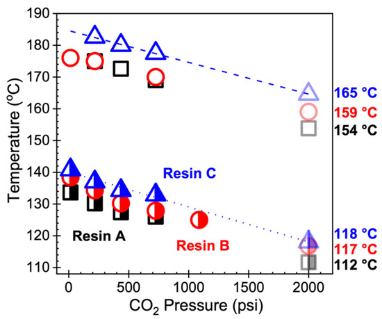 The changes in melting and crystallization temperatures with respect to CO2 pressure were determined using a high-pressure differential scanning calorimeter (HP-DSC, DSC 204 HP Phoenix®, NETZSCH, Selb, Germany). Samples were placed in an aluminum pan and saturated with CO2 at the desired pressure in the HP-DSC chamber. The system was then equilibrated at 50 °C, heated to 210 °C at a rate of 10 °C/min, held isothermal for 5 min, and cooled to 50 °C at a rate of 5.5 °C/min. This temperature profile in the HP-DSC was designed to mimic the thermal history experienced by the sample in the batch foaming chamber under Method 2. The heat–cool cycle was repeated over a range of CO2 pressures, from atmospheric pressure to 1000 psi. For each resin, the onset crystallization temperature (Tc,onset) at 2000 psi (i.e., saturation pressure in batch foaming experiments) was estimated by applying linear extrapolation to the measured data (Figure 4), as this assumption has been shown to be valid for CO2 pressures up to 3600 psi [32]. Similarly, the end melting temperature (Tm,end) at 2000 psi for each resin was obtained using linear extrapolation (valid up to 2000 psi [33]). The Tc,onset values of Resins A, B, and C were 112, 117, and 118 °C, respectively; the Tm,end values were 154, 159, and 165 °C, respectively. Figure 4 shows that the crystallization and melting temperatures decrease linearly with increasing CO2 pressure.