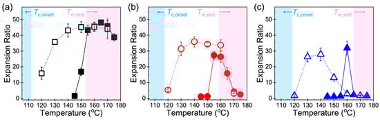 Volume expansion of (a) Resin A, (b) Resin B, and (c) Resin C with respect to foaming temperature. Closed and open symbols (with lines as a guide to the eye) refer to expansion ratios obtained using Method 1 and Method 2, respectively. Shaded areas indicate low and high temperature regions determined by the respective Tc,onset and Tm,end values obtained from HP-DSC measurements in Figure 4.
