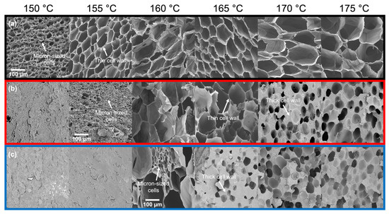SEM images of (a) Resin A, (b) Resin B, and (c) Resin C foams produced using Method 1 (i.e., partial melting of PP). End melting temperatures of the resins are 154 °C, 159 °C, and 165 °C, respectively.