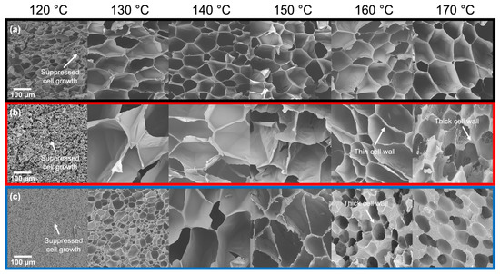 A different way of understanding the effect of crystallization onset on foaming is by considering how much the polymer is supercooled in Method 2. According to the Hoffman nucleation theory for polymer crystallization, the degree of supercooling () is defined as the difference between the equilibrium melting temperature () and the crystallization temperature [40]. Several works have estimated the of iPP from the Gibbs–Thompson plot using different techniques, such as optical microscopy [41] and differential scanning calorimetry [42], resulting in a value of 186 °C. In a study on the crystallization kinetics of linear and LCB PP, Tian et al. [43] used the Hoffman–Weeks linear extrapolation method [44] to estimate the of linear PP as 190 °C and that of LCB PP with a high level of branching as 191 °C. Assuming that the three PP resins studied in the present work have comparable values similar to those in the literature, the degree of supercooling in each of the three resins is essentially dictated by their individual onset crystallization temperatures. Therefore, it can be said that PP possessing a higher is capable of foaming over a wider range of temperatures, particularly due to the low Tc,onset. This premise is consistent with the observations made of the expansion behavior of resins subjected to Method 2, where Tc,onset-A < Tc,onset-B < Tc,onset-C resulted in A > B > C for samples foamed at the lowest Tfoaming of 120 °C (Figure 5). The importance of supercooling becomes more evident when a comparison is made between the foaming behaviors resulting from Method 1 and Method 2. In the former method, the sample never experiences undercooling, unless it undergoes complete melting and subsequent cooling. As such, not only is foaming limited to only a narrow range of temperatures, but also the cellular morphology of foams obtained at low temperatures is extremely non-uniform due to pre-existing crystallites and/or crystals that are newly formed via heterogenous nucleation [5].