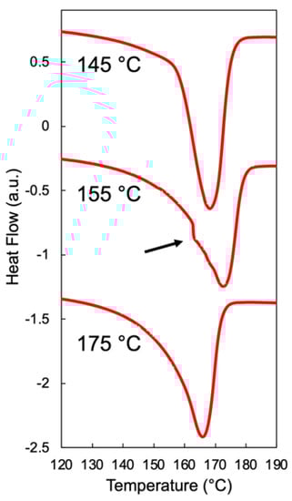When foaming is induced below Tm,end, discrepancies in the cell structure resulting from the two methods begin to emerge. In Method 1, the smallest cell sizes were observed at temperatures 4–5 °C below the Tm,end of each resin (Figure 6). The corresponding cell morphology was characterized by micron-sized cells for Resin A and Resin B with the exception of Resin C, which showed a bimodal cell size distribution separated by an order of magnitude (Figure S2). Based on these observations, the optimal foaming behavior of each resin in Method 1 may be the result of the aforementioned intricate balance between a small presence of crystalline domains and an abundance of amorphous regions dissolved with CO2. This speculation is supported by the differential scanning calorimetry (DSC) measurements of samples foamed at different temperatures under Method 1 (Figure 8). Using Resin B as the representative material, the sample foamed at 155 °C—which led to the optimal expansion ratio and smallest cell size—exhibited a shoulder near the melting peak in the heating endotherm. The appearance of this shoulder confirms that crystallites were present in the sample prior to foaming, and the melting peak at a higher temperature indicates that new crystals were formed during foaming onto the existing crystallites via heterogeneous nucleation. Such behavior was absent in the DSC curves of the samples foamed at the two temperature extremes (145 °C and 175 °C), as reflected in the single melting peak. Hence, it can be deduced that the optimal foaming behavior of resins under Method 1 is governed by the saturation temperature that sufficiently melts the polymer but leaves a small number of crystals unmolten.