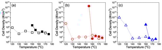 Cell density of (a) Resin A, (b) Resin B, and (c) Resin C foams. Units of cell density correspond to number (#) of nucleated bubbles per volume of foamed polymer. Closed and open symbols (with lines as a guide to the eye) correspond to cell density measurements obtained from foams produced using Method 1 and Method 2, respectively.