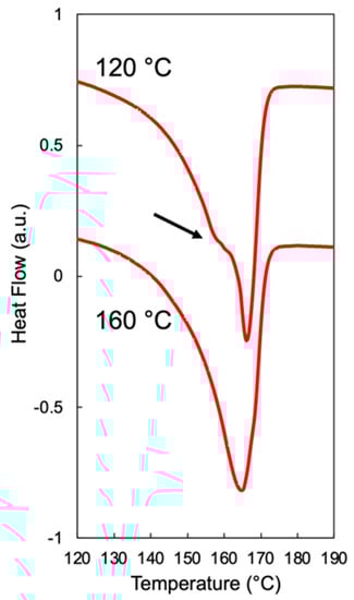 The effect of crystallization onset on foaming becomes relevant when a semi-crystalline polymer is fully molten and foamed in its supercooled state. Thus, when it comes to the foaming of polymers using Method 2 described in this work, the onset of crystallization can be interpreted as the lower temperature limit above which noticeable volume expansion can be achieved. The question then becomes how far above the Tc,onset the sample needs to be to allow cell nucleation and sufficient bubble growth, in which the latter may be significantly affected by the viscosity of the polymer melt. That is, if the temperature of the molten polymer is too low, its chain mobility may be restricted and thereby limit the growth of nucleated bubbles. Such behavior was observed in Resins B and C under Method 2 at the lowest foaming temperature of 120 °C, which is 2–3 °C above the Tc,onset value estimated from HP-DSC data. While cell sizes in the range of 1–10 µm were achieved in samples foamed at this temperature, the expansion ratio below five reflects that the samples could hardly expand. Upon further analysis, the suppressed expansion at the lowest foaming temperature was shown to be the result of crystals developed during cooling and non-isothermal saturation, as reflected in the DSC measurements of Resin B foamed at 120 °C versus 160 °C under Method 2 (Figure 11). In particular, the heating endotherm of Resin B foamed at 160 °C exhibited a single melting peak while that at 120 °C showed a clear shoulder at a lower temperature and a melting peak at a higher temperature, similar to the observations made in Figure 8. While crystallization was not anticipated to occur until 117 °C in Resin B, the fact that crystals were formed at 120 °C implies that either Tc,onset was underestimated or that there was a mismatch between the temperature of the sample and that of the foaming chamber. The repeatability of the foaming experiments strongly suggests that the temperature control of the system is reliable and accurate; hence, it is more likely that the linear extrapolation resulted in an underestimation of Tc,onset. In fact, foaming experiments at smaller temperature intervals would be able to reveal the degree of underestimation; however, that is beyond the scope of this work. It is more important to realize that the estimation may be a couple degrees off, as reflected in the noticeable expansion achieved in Resin A at 120 °C, which is 8 °C above the perhaps underestimated Tc,onset of 112 °C. Therefore, it can be concluded that foaming induced at temperatures at least 8 °C above Tc,onset may lead to sensible expansion of the molten polymer–gas mixture. When the foaming temperature is further above Tc,onset, optimal foaming behavior—characterized by high volume expansion and uniform cell density—is achieved, which often emerges as a “mountain-shaped” profile in continuous foaming processes as the die temperature approaches the crystallization temperature of the polymer–gas mixture [39].