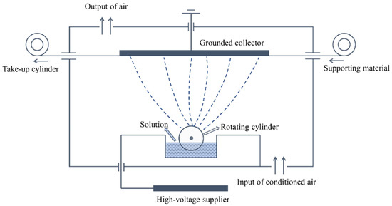 A certain quantity of aerogels was applied in the PTFE dispersion as received, the mixture was stirred for 2 h at room temperature (around 25 °C) to achieve a homogeneous solution and avoid any visible deposition. After that, the mixture was delivered to the Nanospider instrument NS 1WS500U (Elmarco Inc., Morrisville, NC, USA) for electrospraying as shown in Figure 1.