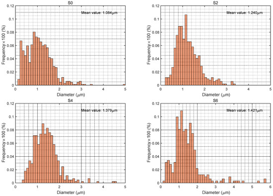 As seen in Figure 5, the particle sizes of each sample were narrowly distributed ranging from 0.1 to 5.8 μm. Sample S0 with pure PTFE particles, had the lowest average size 1.084 μm. Apparently, applying aerogels in the spinning liquid increased the particles by over 2 μm. The introduction of aerogels changed the nature of the spinning liquid, such as electrical conductivity and surface tension, affecting the formation of the electro-sprayed layer as well as the composition of different particles in the layer. Aerogels slightly increased the electrical conductivity of the spinning liquid, since the surface groups present on aerogels could offer some electrical charges. Meanwhile, the surface tension of the liquid system was reduced because of the balancing force between the liquid and aerogels. Thus, the flow rate was probably increased, the liquid could carry more particles to be deposited on the nonwoven substrate. As the aerogel content applied in spinning liquid increased, the mean particle size of the electrosprayed particles slightly increased since the flow rate and the proportion of larger particles present in the composites increased. However, the value did not increase that much because the PTFE particles, which had smaller dimensions, dominated in the electrosprayed layers.