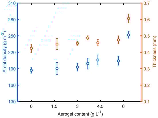 The weight of the multilayered materials tended to increase as the aerogel content increased, as seen in Figure 6. This was probably due to the change in liquid nature, which affected the electrospraying process and formation of the electrosprayed microporous materials, as explained above. With the addition of fully hydrophobic aerogels, the conductivity and surface tension of the liquid were altered correspondingly, leading to denser materials. As expected, the thickness of the electrosprayed materials increased with the increase in aerogel content as well. Since the aerogels generally had a larger particle size than a single PTFE particle, aerogels present in the overall structure contributed to thicker materials.