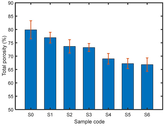 The calculated values of Po are shown in Figure 7. The values range from 79% to 68%, varying with the aerogel content. As the aerogel content increased, the calculated total porosity decreased. This is because the deposit morphology is determined by the dynamics of particle arrival to the deposit. The motion of particles approaching the collector involves a combination of a ballistic motion with a certain mean particle velocity v and a stochastic motion characterized by a diffusion coefficient Dp,diff [31]. These two parameters together with the particle diameter D can be combined in a dimensionless parameter, the P é clet number
