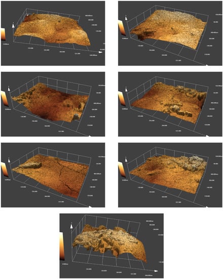 Figure 8 shows the 3D surface morphology of the electrosprayed materials. On a micrometer scale all the materials had a rough surface with plenty of peaks and valleys. The number of peaks and valleys, the height of peaks, and the depth of valleys differ for each material, depending on the content of aerogel applied. The overall surfaces were flatter for the sample without aerogels (sample S0) or with fewer aerogels (sample S1), while more abrupt peaks and deep valleys appeared on the surface of samples containing more aerogels. As the aerogel content increased, the sharpness of peaks tended to increase as well. The main reason could be that the aerogel particles had a larger dimension in comparison with PTFE particles, the introduction of aerogels brought higher peaks and deeper valleys, thus creating rougher surfaces. With the increase in aerogel content, more peaks and valleys appeared, and the surface roughness of the overall materials increased correspondingly.