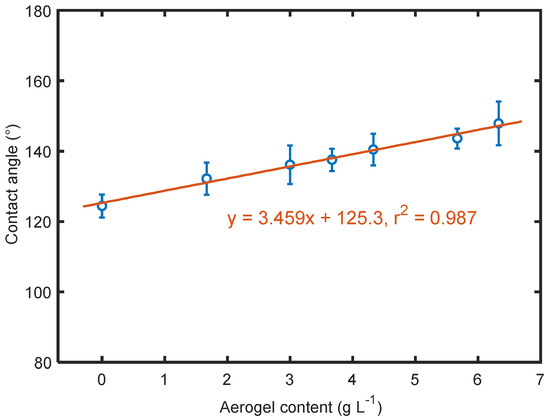 According to the experimental [32] and simulation results [33], the water contact angle for a smooth PTFE surface was around 108–114°. In this work, the water droplet on the electrosprayed PTFE surface (sample S0) showed a contact angle of approximately 124.44°, 10° more than that of a smooth PTFE surface. This increase was attributed to the surface roughness created by nano spray, allowing more air pockets to be left between the droplet and the material surface. Contact angles of the electrosprayed materials are compared in Figure 9. The contact angles were all over 90°, indicating that all the materials were hydrophobic. Since silica aerogels generally had stronger hydrophobicity than PTFE [34], the contact angle of the electrosprayed PTFE embedded with aerogels increased with the gradual increment in aerogel content. The maximum increase in contact angle was up to 23.44° in this work. A very strong linear relationship between contact angle and aerogel content was observed. This could be mainly due to the introduction of the strong hydrophobic silica aerogel and the gradual increase in the number of hydrophobic groups present on the aerogel surface, which agrees well with previous studies [35,36,37]. In addition, the hydrophobicity of the electrosprayed materials strongly relied on surface roughness, which varied when different contents of aerogels were applied as mentioned above.