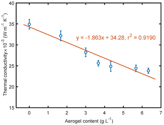 As expected, aerogels present in the electrosprayed materials contributed to lower thermal conductivity as seen in Figure 10. The thermal conductivity of the overall structure depended on heat transfer through each component, the PTFE solid, aerogels, and void space in the materials, which entrapped stagnant air. The total thermal conductivity is given by , where ki is the thermal conductivity of i th component in the material contributing to heat transfer, and fi is the corresponding volume fraction of that component. Since aerogels have much lower thermal conductivity than PTFE, as the aerogel content increases the proportion of aerogel thermal conductivity kaerogel increases, causing lower overall thermal conductivity of the material. Especially when the aerogel content was above 4 g/L, the electrosprayed materials achieved very low thermal conductivity close to 0.024 W/(m·K), proving these materials possess superior ability to prevent heat transfer. The relationship between the two parameters shows that thermal conductivity is directly proportional to aerogel content. However, considering the calculated total porosity of each material, it should be noticed that the thermal conductivity of this material was not negatively correlated with total porosity; instead, it tended to decrease with the decrease in total porosity. Generally, the pores in a fibrous material are microscale; in this case, the porosity of the material could be the main factor determining heat transfer rate. However, if the pores are small enough to become comparable to the mean free path of air [38], the cavity could effectively restrict the movement of air particles, causing a significant decrease in thermal conductivity in addition to eliminating convection. Benefitting from a large amount of interconnected nanoscale pores in silica structure, the restriction on heat transfer, which strongly relies on pore size, increased as the aerogel content increased, leading to lower thermal conductivity, while the materials had relatively lower porosity.