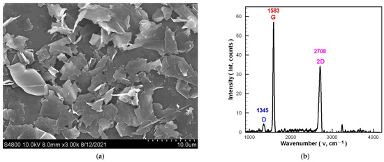 Figure 1 is the apparent morphology and material analysis of the GN. Figure 1a shows a scanning electron microscope (SEM; S4800, Hitachi, Saitama, Japan) image of the GN. Its apparent morphology is flaky, and the sheet diameter is within the specifications declared by the supplier. Figure 1b is the Raman spectra of the GN tested by the Raman spectroscopy (532.15 nm, NRS4100, Jasco, Tokyo, Japan). Like a typical GN, the G peak and 2D peak appear around 1582 cm−1 (1583 cm−1) and 2700 cm−1 (2708 cm−1), respectively. Furthermore, the I2D/IG of single-layer GN is greater than 1, and the I2D/IG of few-layer GN is greater than 0.5 [34,35,36]. Since the GN used in this study has I2D/IG = 0.599, it can be confirmed that the few-layer GN meets the specifications declared by the supplier because GN exhibits a flake-powder morphology with a defect peak (D peak) at 1345 cm−1, and its ID/IG = 0.077.