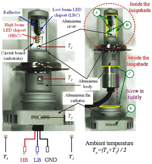 Figure 3 shows the automotive LED lamp (6000 K pure white LUXEON; LED-HL [≈H4], PHILIPS, Shanghai, China) used for testing in this study. This automotive LED lamp is utilized as the headlight of the car. The rated supply voltage, input current, and power consumption for this automotive LED lamp are 13.2 V, 1.2 A, and 15.5 W, respectively. On both sides of the lamp, there exists one LED module consisting of one low beam LED chipset (LBC) and one high beam LED chipset (HBC), where each LED chipset consists of three LEDs. There is a reflector under the LBC on both sides to control the irradiation direction of the LBC. The LED module on both sides is riveted on the aluminum substrate. All thermocouples (1/0.2 mm × 2C, T-type, accuracy: ±0.75%) used are of the same form and have been calibrated before the experiment. Three thermocouples are installed on the substrate (circuit board, T1), aluminum body (T2), and aluminum fin radiator (T3), respectively, to measure the temperature at these points. The thermocouple that measures the temperature of the substrate was installed on the aluminum rivets. In addition, two thermocouples (T4 and T5) were installed in the test space of the automotive LED lamp to measure the Ta of the experiment. The average value of the measurement data of the two thermocouples was defined as the averaged Ta.