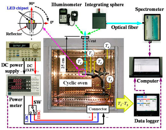 The illuminance, spectrum, and power consumption at different Ta (40, 60, and 80 °C) are measured to evaluate the impact of applying the GNHC under different scenarios (Case 0 to Case 2). The automotive LED lamp is fixed on the holder and placed in a temperature-controllable cyclic oven (internal dimensions: W60 × D50 × H50; DH-600N, YOTEC, Hsinchu, Taiwan) to test the above-mentioned experimental parameters. Figure 5 is a schematic diagram of the experimental measurement system. The center of the LED matrix is aligned with the air vent located at the top of the oven for illuminance and spectrum measurement purposes. The measurement distance is about 250 mm. The illuminance and spectrum (350–800 nm) of the automotive LED lamp is measured by an illuminance meter (LX-103, Lutron, Taipei City, Taiwan; accuracy: ±5.0%) and a spectrometer (wavelength range: 200–850 nm; BRC112E-V QuestTMX, B&W Tek, Plainsboro, NJ, USA) with an integrating sphere (ø = 5 cm), respectively. Because the measurement deviation of the illuminance meter is relatively high, each experimental parameter is measured six times and averaged as the final experimental data. The illuminance and spectrum of the automotive LED lamp are measured in two directions by rotating a pre-defined angle (0 and 90 degrees) to understand the influence of different directions and Ta. The components of the automotive LED lamp in the 0 degrees and 180 degrees directions are exactly the same, and the positions are symmetrical. Therefore, only one of them is selected for testing.