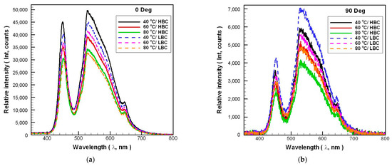 Figure 6 shows the test results of the spectra of Case 0 under different experimental conditions. The integration time of spectrometer used to measure the spectrum of the automotive LED lamps with different experimental parameters is 200 ms. Therefore, the relative intensity of the LED’s spectrum distribution is comparable. It can be seen from Figure 6 that regardless of the irradiation angle of 0 degrees or 90 degrees, the relationship between the Ta and the relative intensity of the spectrum is inversely proportional. However, the Ta has almost no effect on the spectrum distribution, and its color temperature meets the manufacturer’s declared specification of 6000 K (the difference in chromaticity coordinates is within 2%) under various Ta. Therefore, the influence of Ta on the spectral characteristics of automotive LED lamps will not be discussed in subsequent cases.