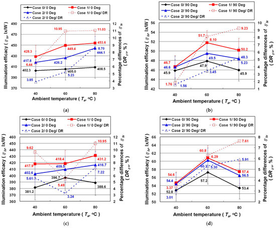 In order to more clearly show the difference between the P and the IL of Case 0, Case 1, and Case 2, this study defines the IL provided by the unit P as the illuminance efficacy (ηlx, lx/W)). Figure 7 shows the ηlx and the percentage differences of ηlx (DRηlx, %) for the automotive LED lamps under different experimental conditions. Figure 7 shows that ηlx of the automotive LED lamp is certainly improved in Case 1 and Case 2, where the former is slightly better than the latter. The maximum ηlx of Case 1 and Case 2 with the high beam, irradiation angle of 0 degrees, and Ta of 80 °C is 11.03% and 8.70% higher than Case 0, respectively.
