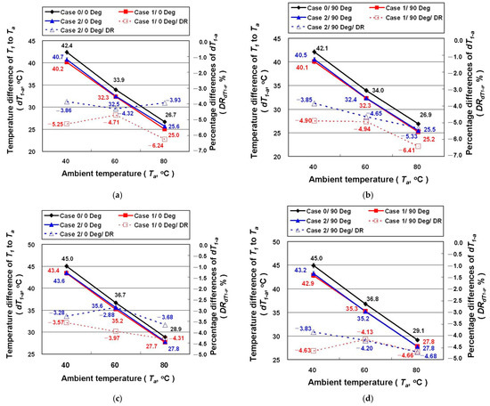 - The minimum dT1-a of Case 1 and Case 2 with the high beam, irradiation angle of 90 degrees, and Ta at 80 °C, are 6.41% and 5.33% lower than Case 0, respectively.