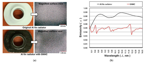 Lastly, we use the Fourier-transform infrared spectroscopy (FTIR; IRSpirit, Shimadzu, Kyoto, Japan) to measure the ε of 8–14 μm on the surface of the original aluminum fin radiator and the GNHC coating. Figure 8b shows the test results of ε. The average ε of the original aluminum fin radiator and the GNHC coating surface are 0.98 and 0.95, respectively. Usually, the ε of aluminum metal is low, so we believe that the surface of this aluminum fin radiator has been specially treated or coated with a special material to achieve such a high ε. As a result, the aluminum fin radiator’s surface radiant heat transfer capacity is actually lowered by the GNHC coating. In addition, the heat-transfer-related factors cause the heat dissipation capacity of the aluminum fin radiator coated with GNHC to be lower than that of the original aluminum fin radiator.