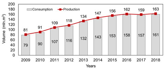 Wood-based materials are popular materials that are still used extensively as an alternative to solid wood across many industries. Among wood-based materials, plywood is widely used in diverse fields, including housing construction, vehicles, laser engraving and interior decoration, furniture production and many others [,]. According to the latest data released by FAO [], during the ten-year period from 2009 to 2018, plywood global production and consumption volumes increased by 101% and 104%, respectively, which amounted to record values in 2018 of over 163 and 161 million m3, respectively (Figure 1). However, over the past two years, due to global problems related to the coronavirus, there has been a stagnation in plywood production and consumption. In 2019, global plywood production decreased by 0.19% in comparison with 2018 [].