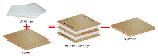 Three-layer plywood samples measuring 300 mm × 300 mm were prepared. LDPE film, which mainly works as the adhesive connecting between two adjacent veneers, was used to manufacture the plywood samples. One sheet of film was incorporated between the veneer sheets. The prepared veneer assemblies (Figure 2) were subjected to hot pressing in the lab press at a pressure of 1.4 MPa and temperature of 160 °C for 4.5 min (Table 1). The mass per unit area of LDPE film at thicknesses of 50 µm, 80 µm, 100 µm and 150 µm was approximately 46.0, 73.6, 92.0 and 138 g/m2, respectively.