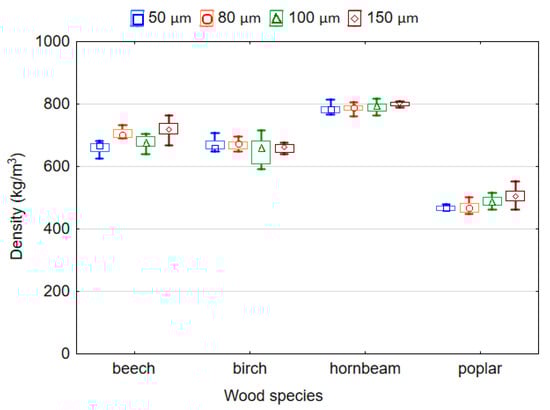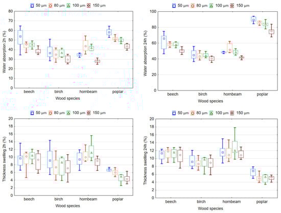 The obtained results are explained by the differences in the anatomical structure of the wood that was used. It can be seen from Figure 9 that the WA of plywood samples decreases with an increase in the density of the wood veneers. This is because the number of pores (internal voids) in the samples with higher density is less than in the samples with lower density. Therefore, the WA of plywood samples from high-density wood veneers occurs mainly due to the penetration of moisture into the cell walls, and this process is much slower than filling the pores with moisture []. Plywood samples from poplar veneers had the lowest percentage of TS because more polymer penetrated per unit volume of this veneer than per unit volume of birch and hornbeam veneers. The obtained values of WA are in good agreement with the commonly accepted statement that WA is related to density []. The higher density results in a lower number of empty spaces, and consequently, lower WA.