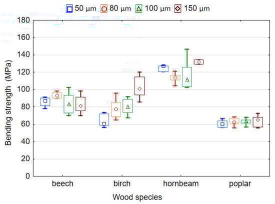 This explains why the samples of birch and poplar plywood with a minimum LDPE film thickness of 50 μm had almost the same bending strength. In this case, not only the densities of the veneer and plywood, but also the thicknesses of the veneer and plywood influenced the bending strength. The thickness of the film at 50 μm can be neglected. These parameters were smaller for poplar plywood compared to birch plywood. The same applies to beech and birch plywood. Beech veneer had a lower density (605 kg/m3) and less thickness compared to birch veneer (655 kg/m3). Beech plywood, which had a lower density and thickness, showed greater bending strength than birch plywood, which had a higher density and thickness.