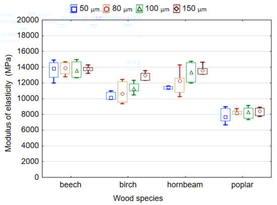 The effect of the thickness of LDPE film and wood species on the MOR and MOE of plywood samples is shown in Figure 6 and Figure 7. It was found that both variables significantly affect the MOR and MOE (p < 0.05). The ANOVA analysis showed that according to the F-values, the wood species has the greatest effect on the MOR (F = 122.307) and MOE (F = 108.160) of the plywood samples, while the thickness of the plastic film affected the MOR (F = 7.488) and MOE (F = 5.731) to a lesser extent. The values of MOR for samples made using film with thicknesses 50, 80 and 100 µm differed insignificantly (p > 0.05). Similarly, as for MOR, the difference in the values of MOE for the thicknesses of 80 and 100 µm as well as 100 and 150 µm was also insignificant (p > 0.05).