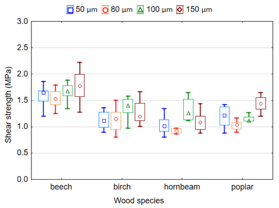 Shear strength is one of the most important mechanical properties of plywood. Figure 8 shows the effects of the wood species and thickness of LDPE film on the shear strength of plywood samples. The obtained mean values of shear strength ranged from 1.54 to 1.77 MPa for beech veneer, from 1.13 to 1.36 MPa for birch veneer, from 0.94 to 1.31 MPa for hornbeam veneer and from 1.03 to 1.44 MPa for poplar veneer. All shear strength values met the requirements of EN 314-2 standards [] for Class 1 (dry conditions) plywood. However, hornbeam samples bonded with 80 µm thickness film failed (0.94 MPa). Among the studied wood species, the highest shear strength mean values correspond to the plywood samples made with birch and beech veneers, that is, 1.22 and 1.64 MPa, respectively. The shear strength mean values of the samples from hornbeam and poplar veneer were the smallest at 1.09 and 1.19 MPa, respectively. The shear strength values for the samples made with birch and poplar veneers differ insignificantly based on Duncan’s test (p > 0.05).