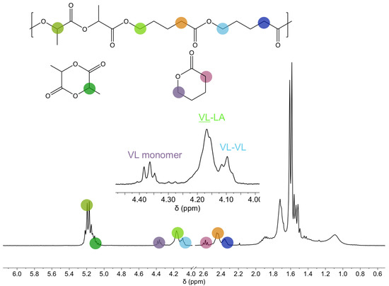 In this section, the chain microstructure of the copolymers and the evolution of this microstructure during the polymerization reaction are addressed. For that, the 1H NMR of one of the copolymers is discussed first, as an example, to show the signals employed to calculate the monomer conversion and to characterize the microstructure of the copolymers. In Figure 1, the 1H NMR corresponding to 50 LA 50 VL copolymer after 180 min reaction time is shown. The following signals have been considered: the signals at 5.17 ppm and 5.04 ppm correspond to the methine of the lactide copolymer and the monomer, respectively. The signals at 4.36 ppm, 4.17 ppm and 4.10 ppm correspond to the methylene next to OCO of valerolactone monomer, VL-LA dyad and VL-VL dyad, respectively. The signal at 2.58 ppm corresponds to the methylene next to COO, the signal at 2.45 ppm to the VL-LA dyad and the one at 2.36 ppm to the VL-VL dyad. In the range of 1.0–2.0 ppm, the signals corresponding to the rest of the methylenes of valerolactone and the methyl of lactide appear.