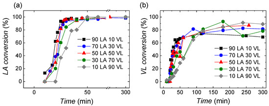 The conversion of lactide and valerolactone monomers at different monomer composition feeds has been followed by 1H NMR spectroscopy, and the data are shown in Figure 2a,b. The obtained results show that the polymerization of lactide is very fast (see Figure 2a), especially in the case of the reactions where the monomer feeds are rich in lactide. The copolymer containing the smallest amount of lactide, 10 LA 90 VL, shows a slower polymerization rate. In all the reactions, full conversion of lactide is achieved in less than 50 min.