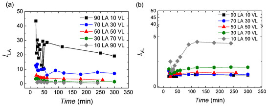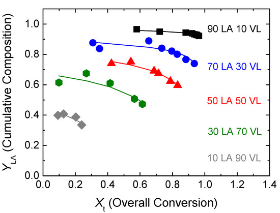In order to gain further insight on the chain microstructure evolution during the reaction, the number-average sequence length of lactide (lLA) and valerolactone (lVL) as well as the randomness character (η) were calculated. For that purpose, Equations (2)–(4) have been employed [23].