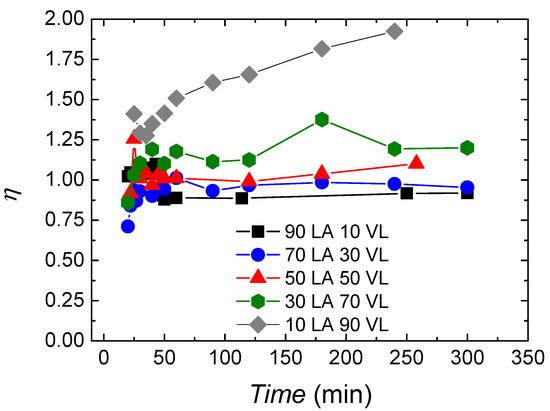 In Figure 4, the randomness character of the copolymers is shown, which allows to analyse the microstructure of the copolymers in further detail. At the beginning of the reaction, the randomness character is about 1 for all the copolymers, showing a random character. During the reaction, the randomness character oscillates between 0.8–1.25. Moreover, 10 LA 90 VL shows a different behaviour with values around 1.25 at the beginning of the reaction and by achieving a value of 2 at the end of the reaction.