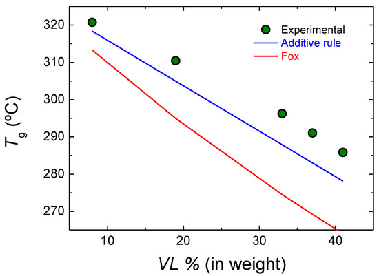 Another model employed to calculate theoretically the glass transition temperature is the Fox model [26,27]: