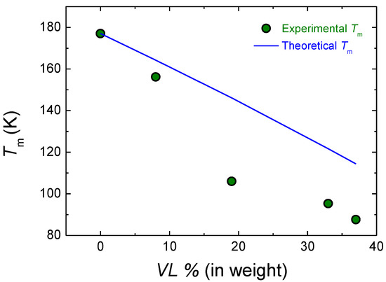 In Figure 7, the experimental melting temperature and the theoretical melting temperature obtained with Equation (5) are shown. The theoretical model overestimates the melting temperature of the copolymers except in the case of the 92 LA 8 VL copolymer, where the theoretical melting temperature is closer to the experimental value. The difference between the theoretical model and the experimental results could arise from the gradient-type nature of the copolymer or the transesterification reactions.