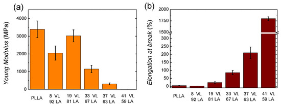 Figure 9a shows the Young modulus and Figure 9b the elongation at break of lactide-valerolactone copolymers. The data can be found in Table S3 in Supplementary Information. As it can be seen in Figure 9a, the incorporation of valerolactone decreases the Young modulus considerably, probably due to the lower glass transition temperature and crystallinity level or the lack of it.