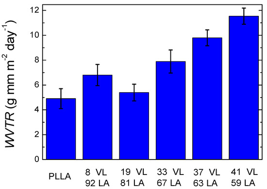 Figure 10 shows the water vapour transmission rate of lactide-valerolactone copolymers (the data are shown in Table S4 in Supplementary Information). PLLA shows a value of 4.9 g mm m−2 day−1, which is similar to the data reported in the literature [20]. In the case of copolymers, the incorporation of valerolactone gradually increases the water vapour transmission rate. The copolymers with the lowest and highest valerolactone content show the following water vapour transmission rates: 6.8 g mm m−2 day−1 for the copolymer with 8% VL and 11.5 g mm m−2 day−1 for the copolymer containing 41% VL. The increase of WVTR with the increment of valerolactone in the copolymer could arise from the lower glass transition temperature together with the lower crystallinity level or the lack of it.