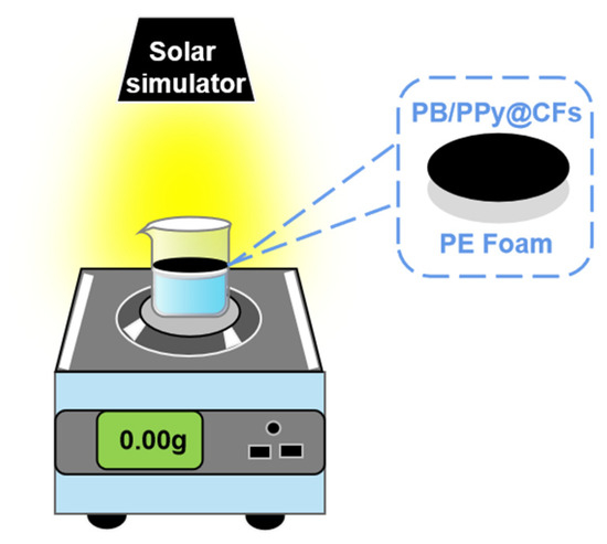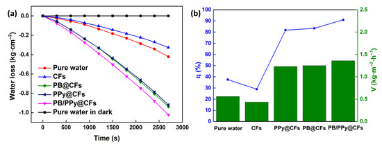 Figure 12a shows the water mass loss of pure water evaporation system in dark and pure water evaporation system at 1 kW·m−2, CFs-foam, PB@CFs-foam, PPy@CFs-foam, and PB/PPy@CFs-foam water evaporation systems at 1 kW·m−2. Among them, the water mass loss of pure water evaporation system in dark reflects the natural evaporation of water. This value needs to be subtracted when calculating the water mass loss of different water evaporation systems irradiated with light. After continuous irradiation at an optical concentration of 1 kW·m−2 for 45 min, the water mass loss of PB/PPy@CFs-foam water evaporation system caused by evaporation was much higher than that of pure water evaporation system, which was because the water below PB/PPy@CFs was transferred to the surface of PB/PPy@CFs through capillary action to form a local thermal region, which accelerated the evaporation of water. According to Figure 12a, the water evaporation rates were calculated. After continuous irradiation at 1 kW·m−2 for 45 min, the water evaporation rates of pure water, CFs, PB@CFs, PPy@CFs, and PB/PPy@CFs systems were 0.56, 0.44, 1.23, 1.25, and 1.36 kg·m−2·h−1, respectively, and the corresponding photothermal conversion efficiencies were 37.50%, 28.98%, 81.69%, 83.38%, and 90.96%, respectively, as shown in Figure 12b. The water evaporation rate of PB/PPy@CFs was the largest, and the light heat conversion efficiency was the highest, which could realize efficient interface water evaporation.